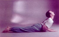 (2) In a very slow motion, begin to raise your head and bend it backwards. Bend your spine well. Do not raise the body suddenly. Rise gradually so that you can actually feel the flexing of the vertebrae, one by one, as the pressure travels downwards from the cervical, dorsal and lumbar regions and, lastly, to the sacral regions. Let the body, from the navel down to the toes, touch the ground. In a very slow motion, reverse the movement while exhaling slowly, and lower your trunk until the forehead rests once again on the floor. Exhale completely. Pauses a few moments before repeating. This asan can be repeated five or six times though beginners should practice it only twice for a few seconds each.