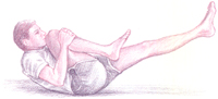 Lift your neck and place your chin on the knee. Remain in this position as long as you can hold your breath. Then breathe slowly, and straighten your leg. Put your head back on the floor. Repeat with the right leg.